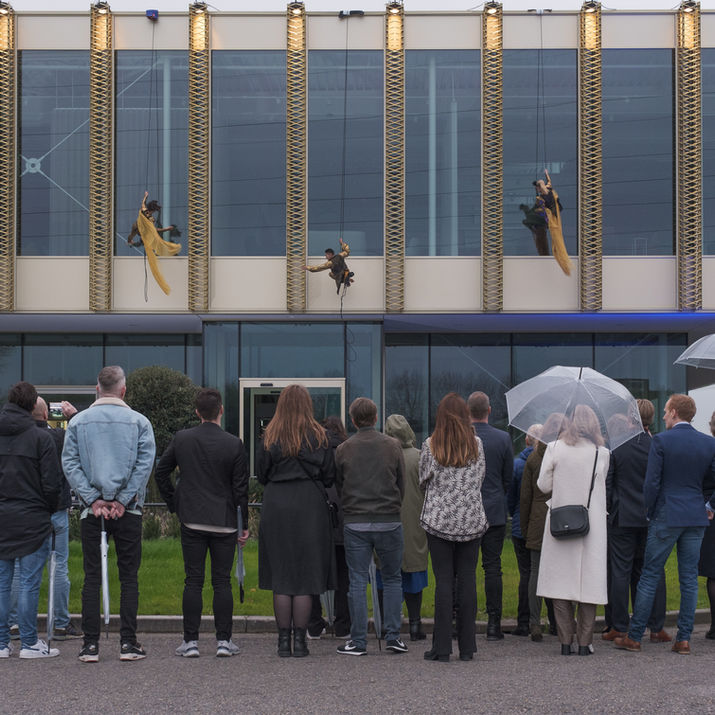 Verticale dans is een samensmelting van architectuur, kunst, momentaalwerk, dans, theater, landschap en natuur. Wij maken altijd gebruik van en speciaal riggingteam voor de veiligheid van onze dansers en het gebouw.